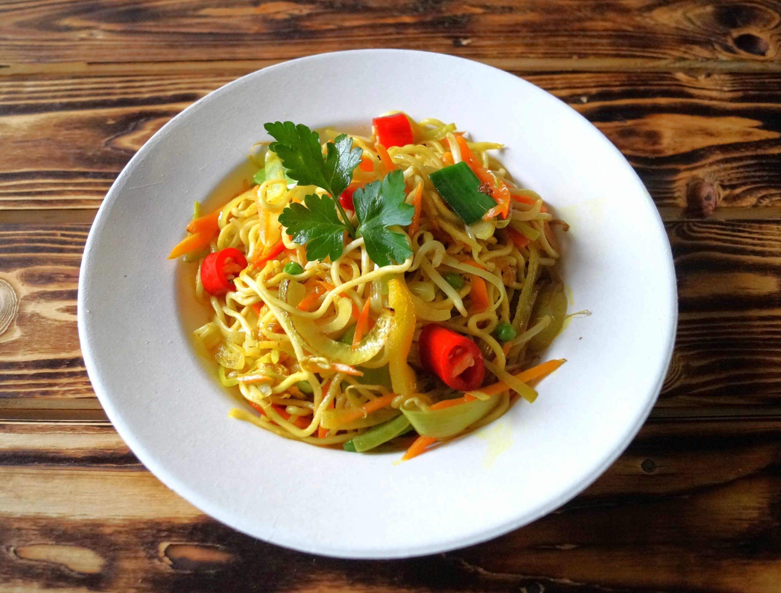 Indonesische Nudelgericht, Ei, asiatische Gemüsestreifen
