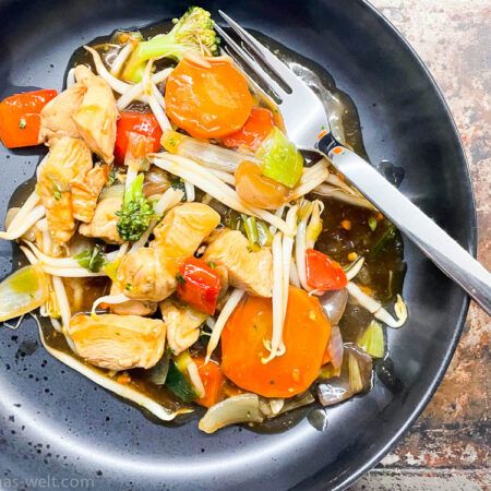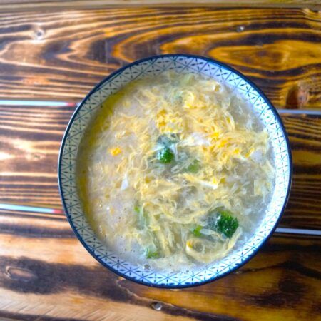 Gebundene Suppe mit Karottenstreifen, Frühlingszwiebeln und einem Ei